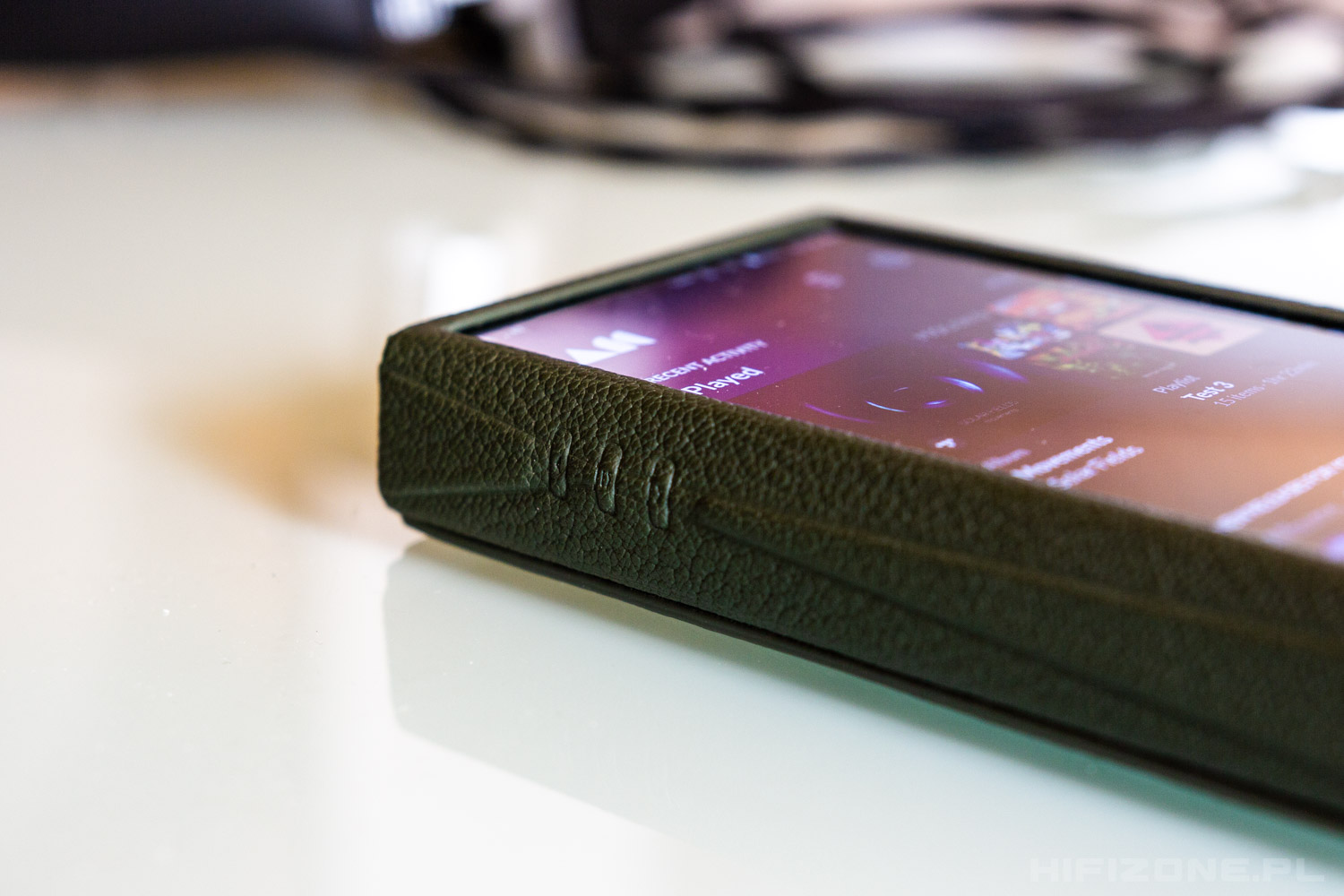 Jeżeli zaś chodzi o najważniejsze elementy sterujące w SP3000 – to od strony CPU mamy tutaj procesor Qualcomm Snapdragon 6125 typu Octa-Core i 8GM pamięci typu DDR4. Od strony wyświetlacza zaś dotykowy ekran o przekątnej 5.46 cala i rozdzielczości Full HD. W przypadku toru audio – oprócz wspomnianych już najnowszych układów AKMa – mamy autorski tor Astella. A to wszystko ładnie zapakowanie w obudowę ze stali nierdzewnej 904L. No i właśnie – odtwarzacz waży według specyfikacji producenta 493 gramy. Zatem lekki nie jest i na pytanie o przenośność takiego rozwiązania każdy powinien sobie sam odpowiedzieć. Oczywiście, w porównaniu do takiego FiiO M17, to flagowy Astell jest dużo, ale to dużo mniejszy. Natomiast waga jest jedna spora – i to bardziej to brałbym tutaj pod uwagę rozważając ewentualną „przenośność” tego odtwarzacza. Jeżeli chodzi zaś o futerał, to takowy oczywiście znajdziemy w komplecie. Jest dobrze dopasowany no i, jak to na Astella przystało, wykonany z wysokiej jakości koziej skóry zabarwionej na zielono.