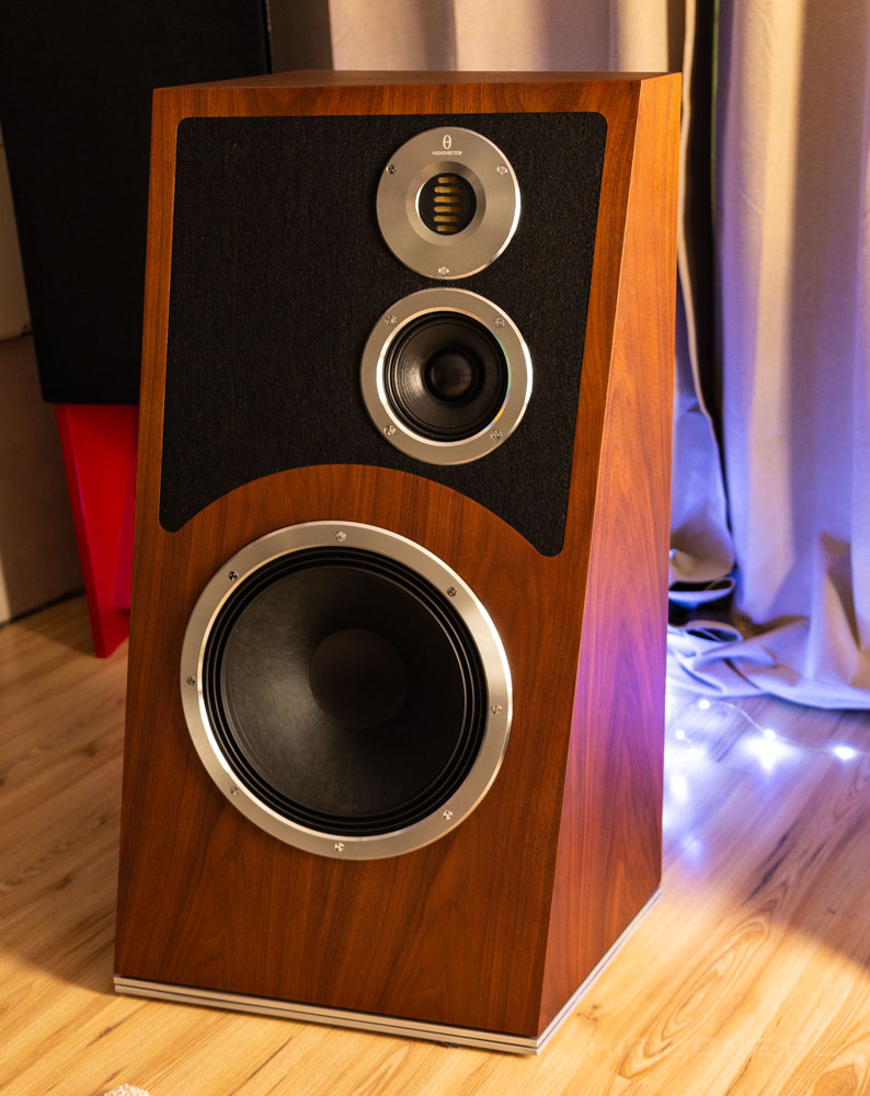 Jeżeli zaś chodzi o całościową koncepcję tych kolumn, to Trapeze Reimagined są konstrukcją trójdrożną, która ma oferować liniową fazę dzięki łagodnym zboczom zwrotnicy (6dB na oktawę). Konstrukcja ta opiera się na trzech dedykowanych przetwornikach. Zaczynając od największego – mamy głośnik basowy o średnicy 12 cali (30 cm) z harmonijkowym zawieszeniem, które Audiovector określa, jako „concertina”. Przetwornik ten posiada celulozową membranę, neodymowy układ magnetyczny oraz dużą cewkę o średnicy 100 mm. Nad nim znajduje się dedykowany przetwornik średnio-tonowy o średnicy 5 cali. Ten z kolei także posiada papierowy stożek, ale widać już, że jest on mocno zaimpregnowany substancją tłumiącą jego rezonanse. Przetwornik wysokotonowy z kolei, jest – paradoksalnie – najmniej zaskakujący, bo mamy tutaj znany z wyższych modeli Audiovectora głośnik AMT w firmowej konfiguracji SEC.