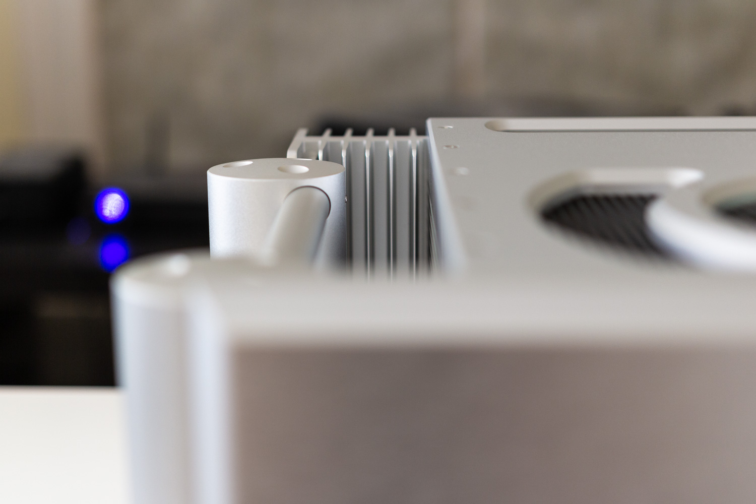 Zacznijmy może od tego, co widać z zewnątrz. Przede wszystkim stylistyka tego urządzenia jest dość – można by rzec – osobliwa, a przy tym też trudno jest odmówić jej po prostu oryginalności. Sama budowa jest natomiast z jednej strony solidna, z drugiej zaś, jeżeli przyjrzeć się uważniej – to także niezwykle praktyczna. Oraz, odważę się stwierdzić, niezwykle przemyślana. Bo z tyłu urządzenia umieszczono radiatory zajmujące niemalże całą tylną ściankę. Z przodu zaś przez otwory na górnej części obudowy widać podświetlony na dość specyficzny, seledynowy kolor zasilacz. Do kwestii zasilacza jeszcze wrócimy, natomiast skupmy się jeszcze chwilę na samej obudowie. Wzmacniacz nie jest jakiś bardzo ciężki (do tego, czemu tak jest – za chwilę dojdziemy), ale waży swoje 22.6 Kg. Jednocześnie był to chyba najłatwiejszy w przenoszeniu i ustawianiu wzmacniacz ze względu na okrągłe wsporniki łączące przednie i tylne kolumny, na których stoi cały wzmacniacz. Pod rzeczonymi kolumnami znajdują się (po trzy w każdej kolumnie) gumowe nóżki, które działają też, jako absorbery rezonansów.