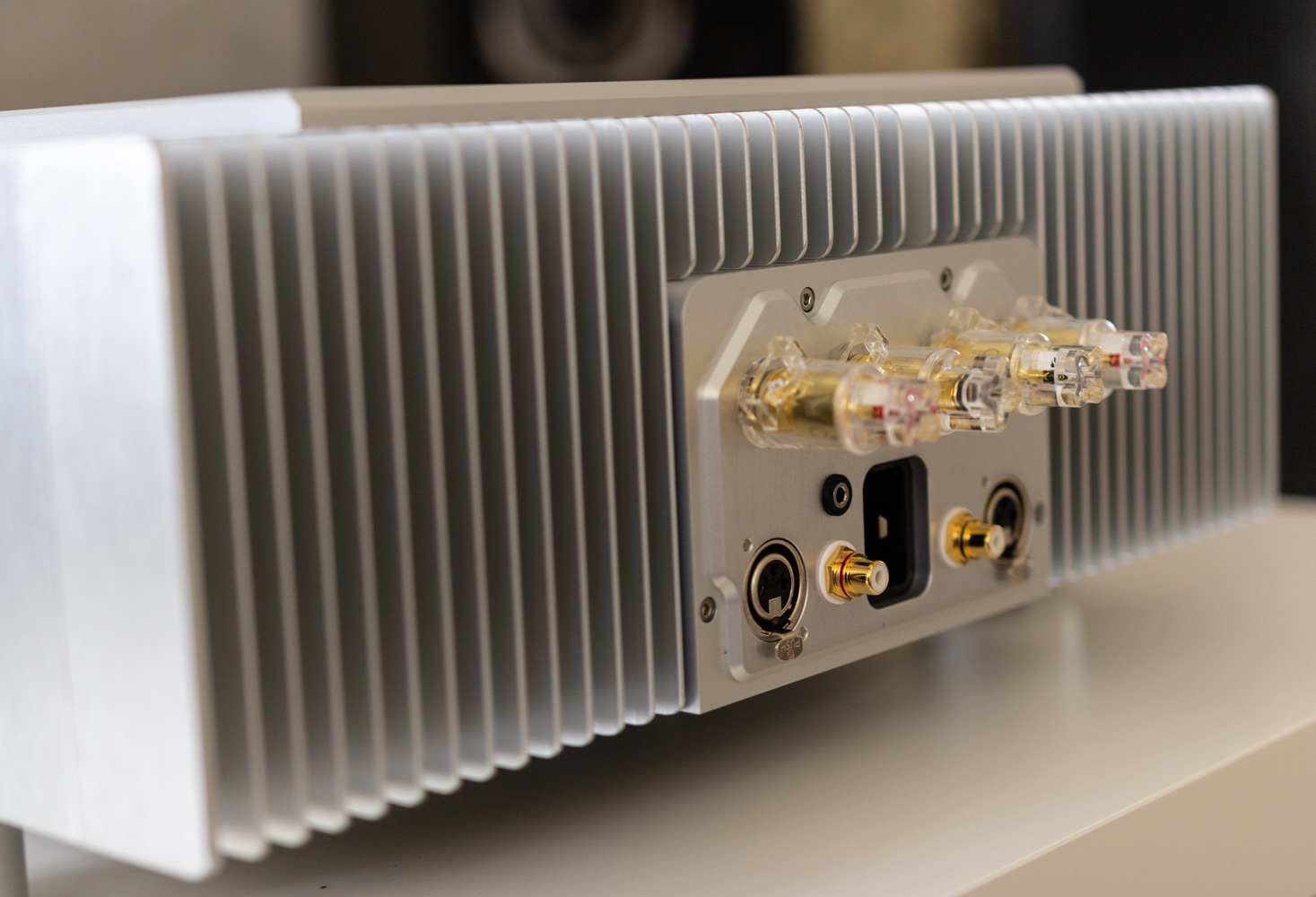Jeżeli już jesteśmy przy zewnętrznej stronie urządzenia, to zwróćmy jeszcze uwagę na tylną ściankę. Znalazły się tam terminale głośnikowe, wejścia RCA oraz XLR oraz oczywiście gniazdo zasilania. To ostatnie to już wysokoprądowe IEC C19. Wszystkie gniazda są bardzo solidne, a na tylnej ściance panuje ogólny porządek. Jej rozkład wpasowuje się w całościową koncepcję obudowy, gdzie forma podąża z funkcją.
