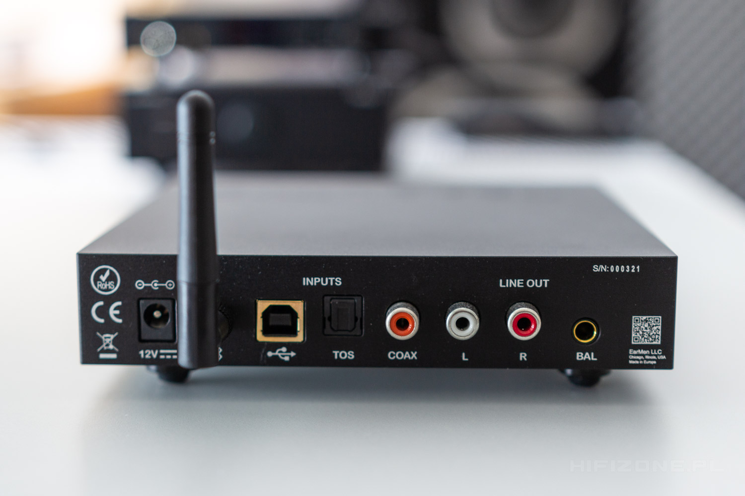 On the front of the unit, we’ll find the display with two buttons on the side, which are responsible for power, Bluetooth pairing and source selection. The display itself is actually very similar to the one found in the CH-Amp: blueish in colour and with just the proper brightness to see what’s actually on it without making the entire room (or more often: a desk) lit at night. The same choice regarding display intensity was made on CH-Amp and the two devices look really good together, so no wonder they are so often paired. As for the – Bluetooth – pairing itself: works as advertised, so no problems nor comments here.