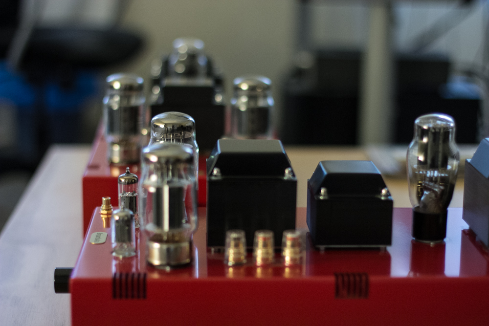 Ekstrawagancki i jednocześnie ciekawy, jest natomiast wygląd wzmacniaczy SinusAudio KT88 – czerwony kolor świetnie się komponuje i z lampami i z pomalowanymi na czarno transformatorami oraz dławikiem. Wiadomo, że o gustach się nie dyskutuje, jednakże monobloki natychmiastowo przyciągały uwagę, każdego, kto miał je okazję zobaczyć na żywo. .