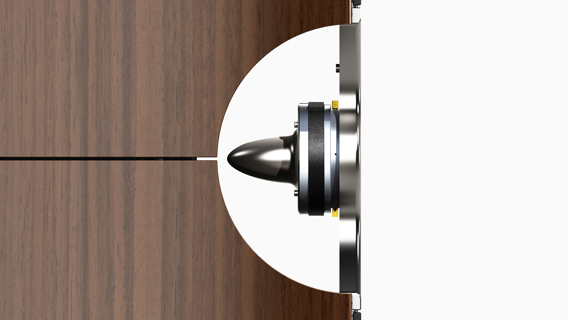 Minimalistyczna, rzeźbiona forma gniazda wyklucza słyszalne zabarwienia, które wynikają z odbicia w tradycyjnych głośnikach, tworząc wrażenie, że przetwornik fenestrii średnich i wysokich częstotliwości zawieszony jest swobodnie w przestrzeni.