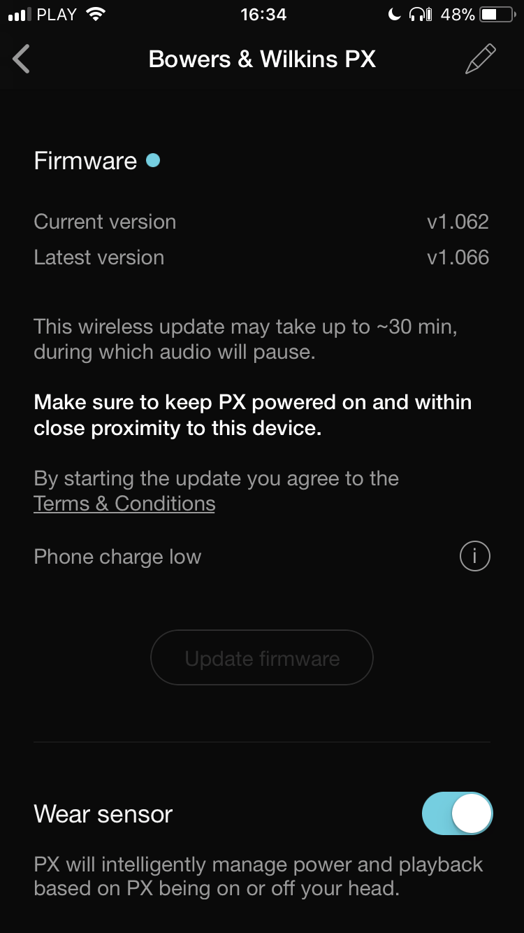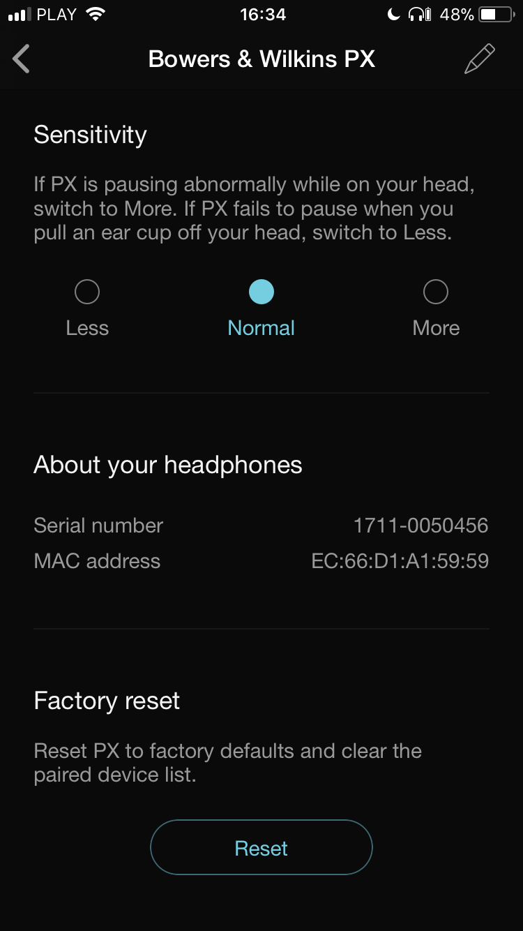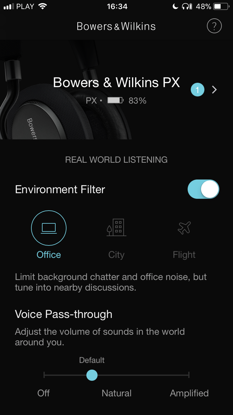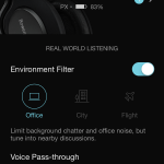 Dedykowana do PX aplikacja jest dużo bardziej rozbudowana, niż chociażby w przypadku tej do Aventho. Nic w tym dziwnego, ponieważ funkcjonalnie PXy oferują dużo więcej – posiadają przede wszystkim aktywną redukcję szumów otoczenia. Z poziomu aplikacji można ją regulować i oferuje ona (w trybie włączonym) trzy ustawienia: „Office”, „City” oraz „Flight”. Nie trudno domyślić się, że w przypadku tej pierwszej wycinanie szumów jest najmniej agresywne a ostatni tryb działa najmocniej i jest dedykowany do samolotu. Dodatkowo, jest jeszcze funkcja „Voice pass-through”, którą można także regulować. Umożliwia ona – podobnie, jak w Sony – słyszenie ludzkiego głosu z zewnątrz w momencie, kiedy włączona jest redukcja szumów.