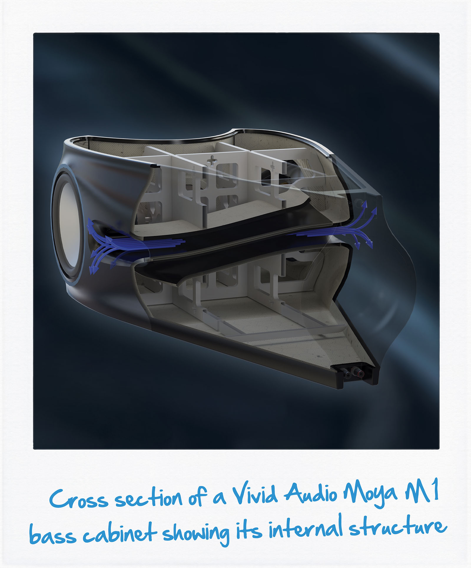 Zastosowanie przez Vivid Audio potężnych portów bass-reflex tłumiących reakcję, eliminuje drgania obudowy i minimalizuje wszelkie efekty turbulencji, które mogą ograniczyć liniowość dolnego pasma.