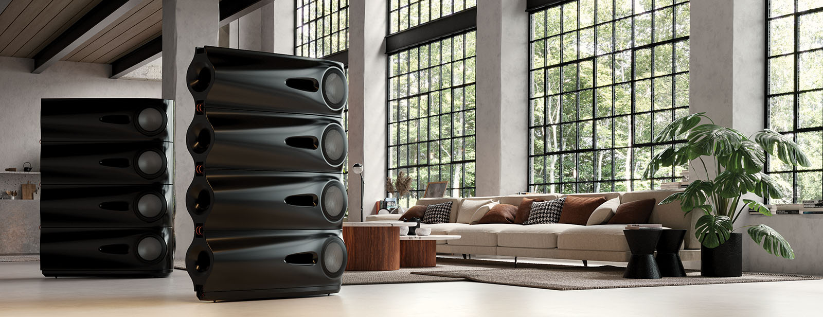 Każda para przetworników jest ustawiona w konfiguracji przeciwsobnej poziomo po obu stronach modułu basowego, a magnesy są połączone solidnym stalowym prętem wiążącym, aby całkowicie wyeliminować siły reakcji i potrzebę ciężkiej obudowy.